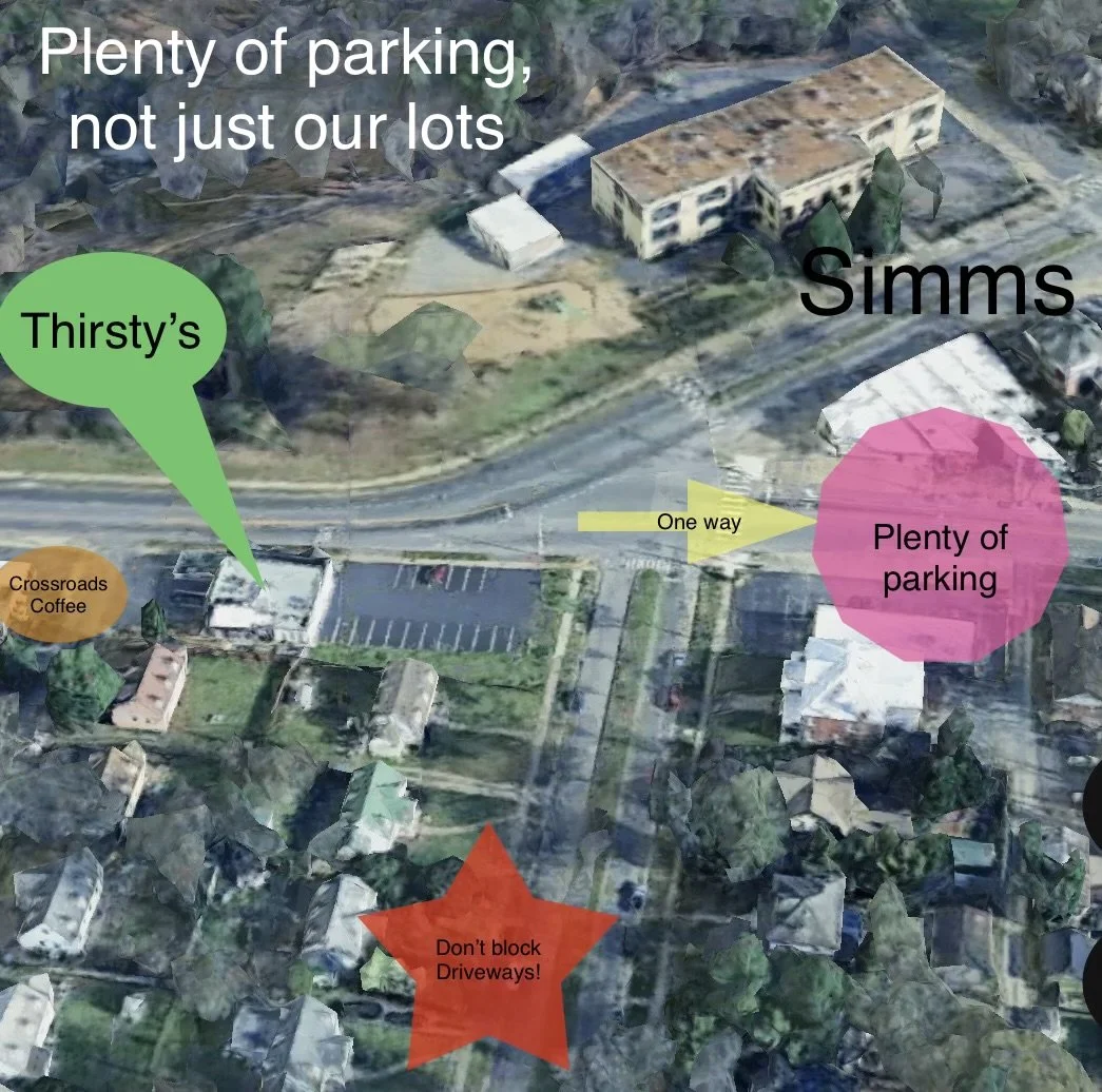 So Thirsty’s has two lots on either side of the building, but they can fill up fast on busy nights. But remember all that dumb construction over the last 2 years? They added a bunch of angled parking a block east on Forest Hill Avenue and safe, large crosswalks.