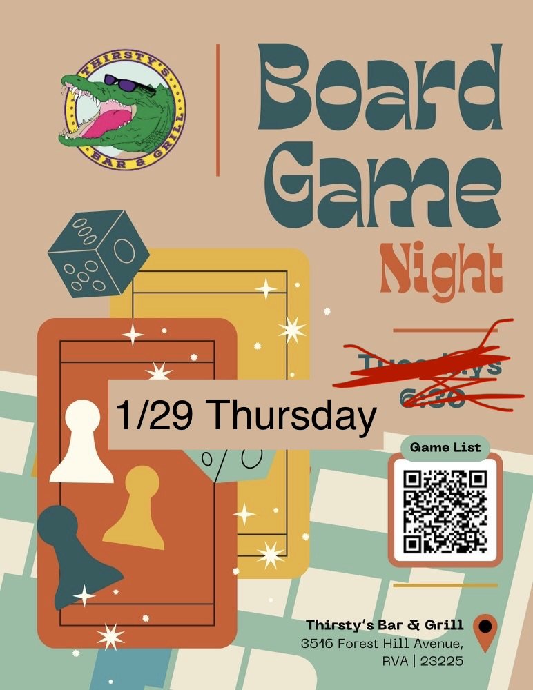 We will be open with a special THIRSTY’s THURSDAY— a Board Game Night in the Lounge and Vinyl in the Bar (A Tuesday Redo)